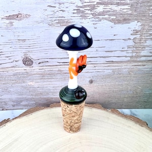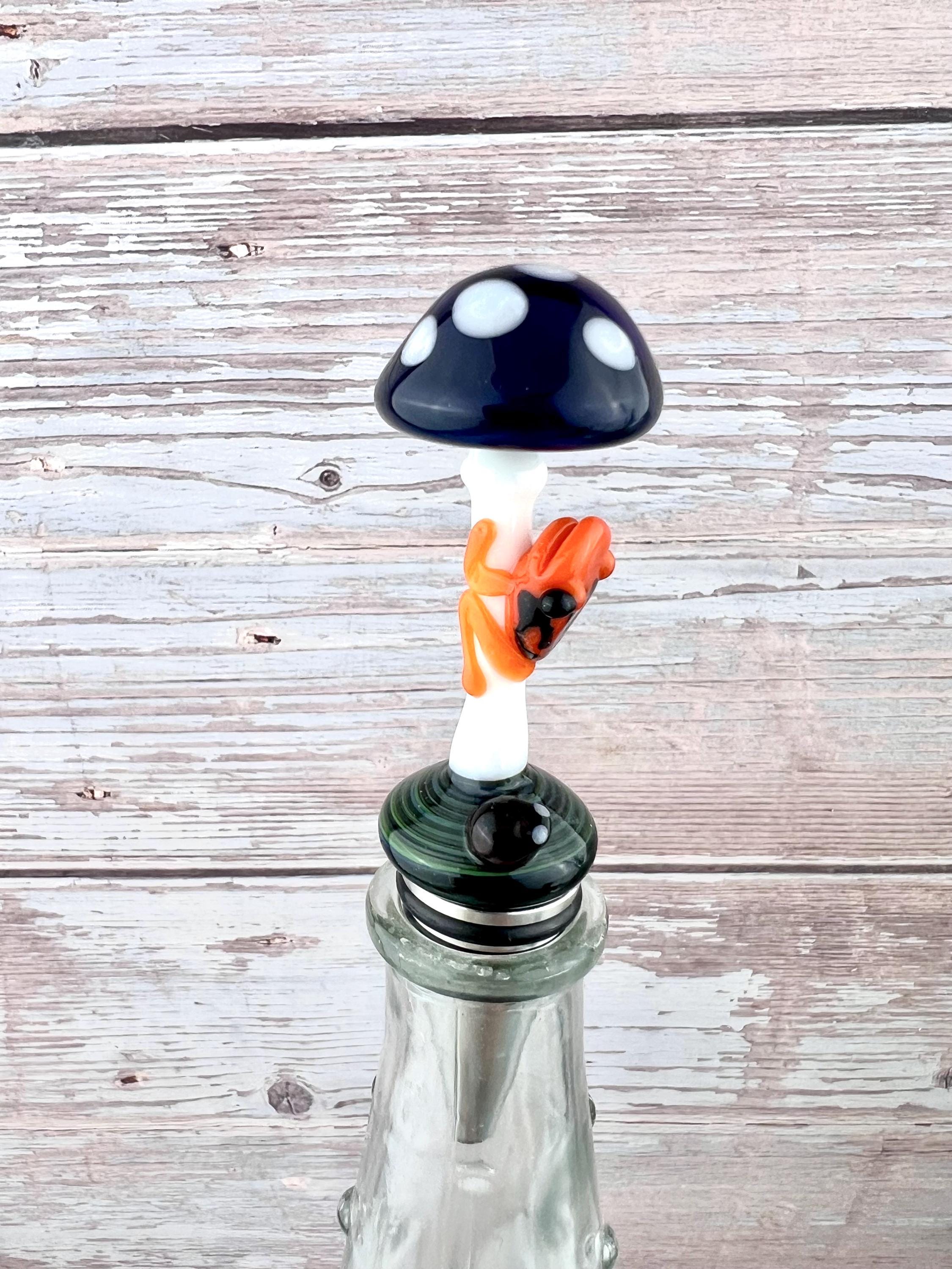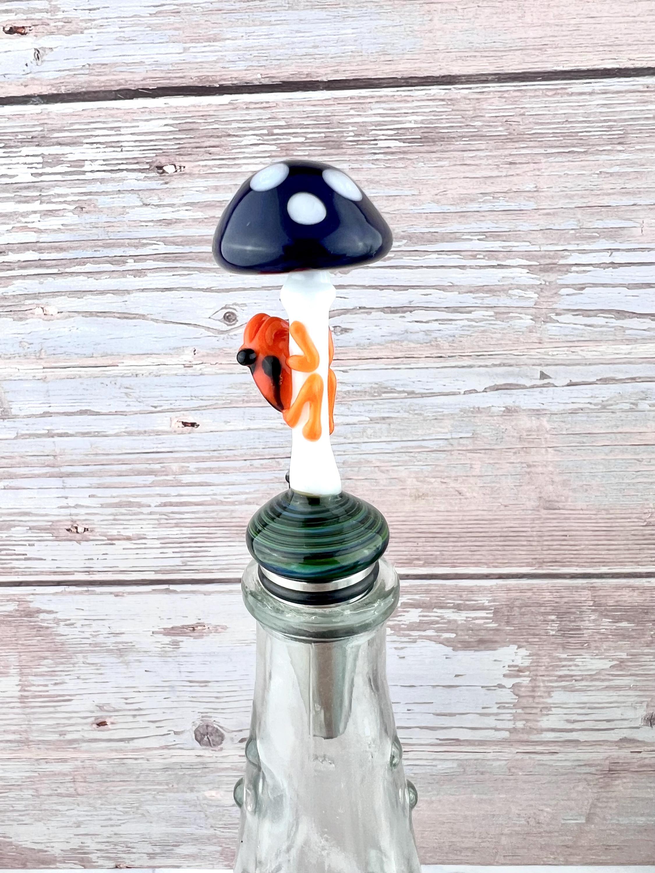 🍄 Custom made to order handblown glass Bottle stoppers with a Frog on Mushroom design on Metal stopper